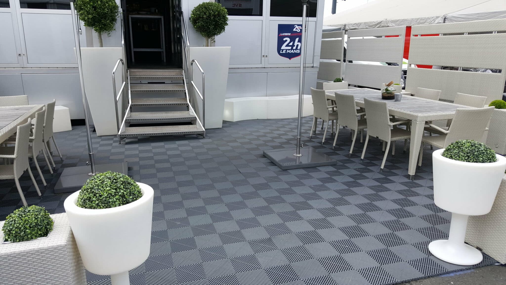 La météo saura-t-elle un jour prévoir que l’événement programmé en extérieur dans 6 mois à tel endroit sera épargné par la pluie ? En attendant, les dalles Polydal Damier évitent les désagréments des sols détrempés.